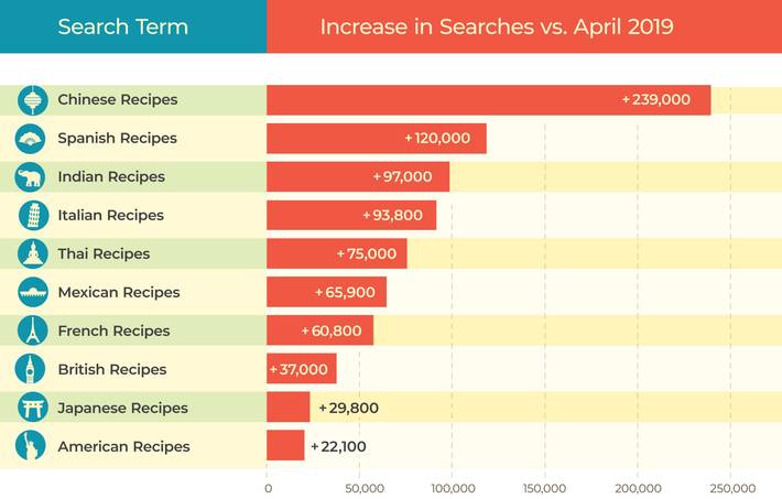 With lockdown measures temporarily closing UK restaurants in March 2020, a growing number of Brits chose to cook at home instead. Here’s how searches for different recipes changed between April 2019 and April 2020: