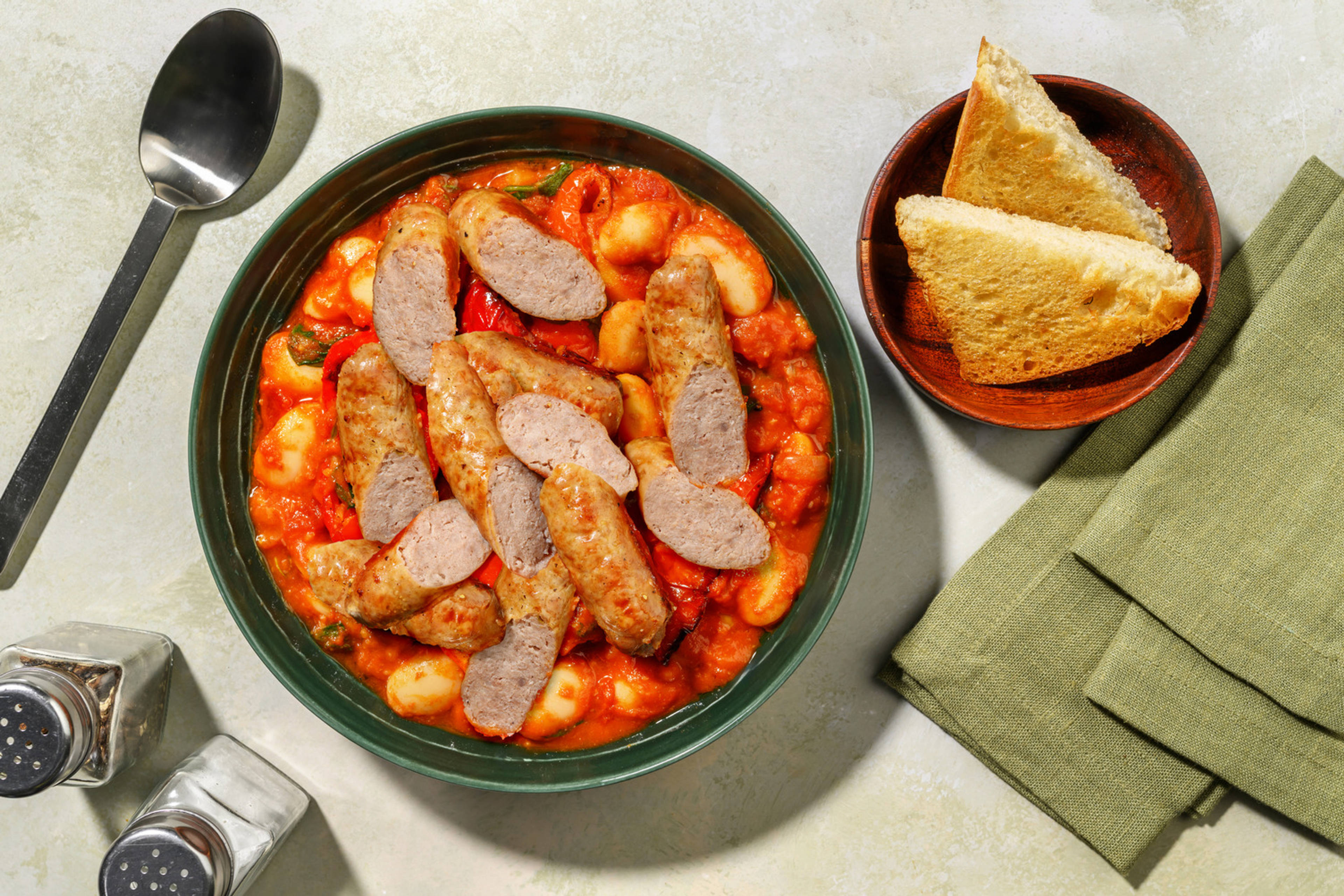 Brown sausages, add onions, garlic, tomatoes, stock, and beans. Simmer briefly, then bake until thick and bubbly.