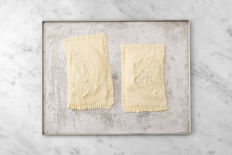 Preheat your oven to 220°C/200°C fan/gas mark 7. Remove the puff pastry from your fridge and allow to come up to room temperature.