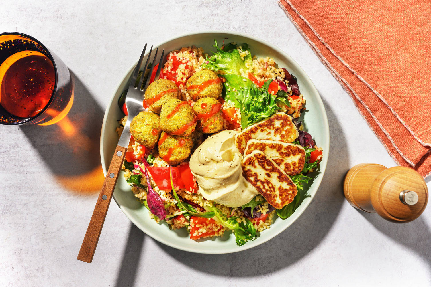 When the 8 mins are up, remove your pan with the veggies in from the heat. Crumble in the feta cheese and gently stir through the veggies. When the bulgur wheat is cooked, fluff it up with a fork. Taste and add more salt and pepper if you feel it needs it.