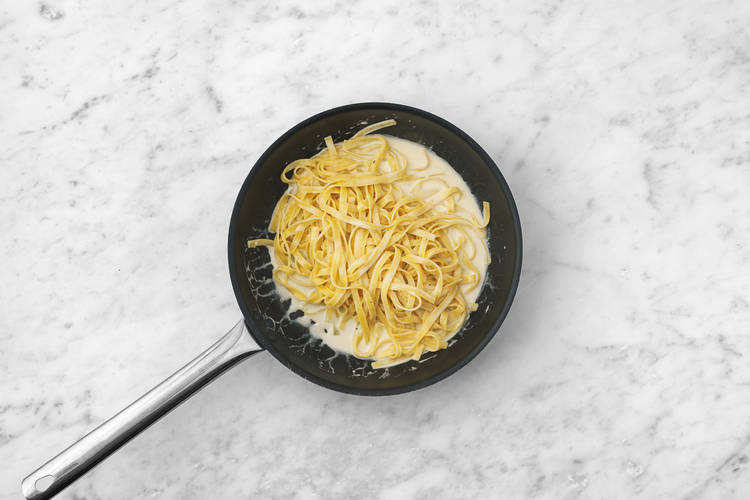• Meanwhile, pop a saucepan on medium-high heat with the creme fraiche, veg stock paste, tagliatelle and water for the sauce (see pantry). Stir together.