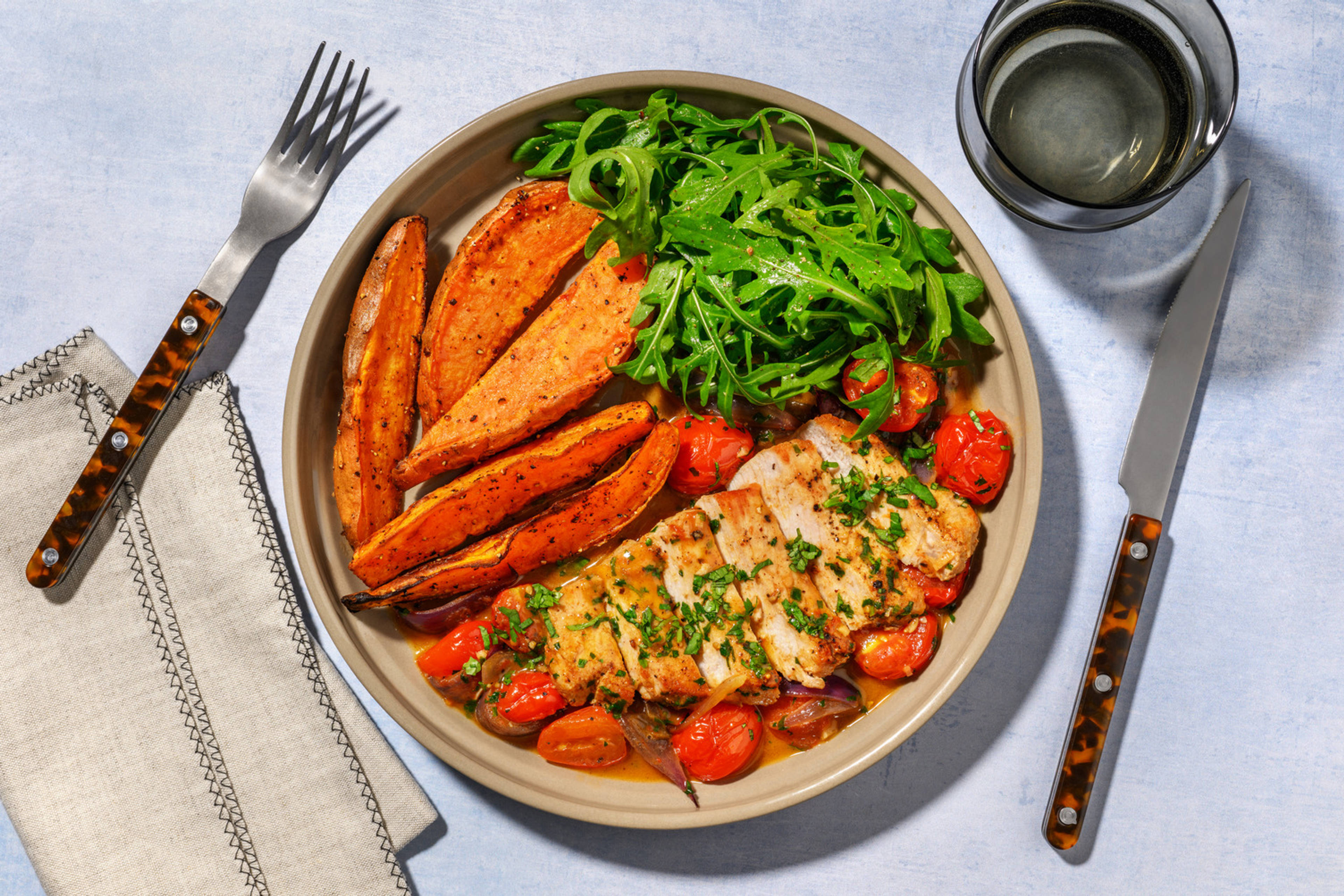 a) Meanwhile, pop the rocket and baby plum tomatoes into a bowl.