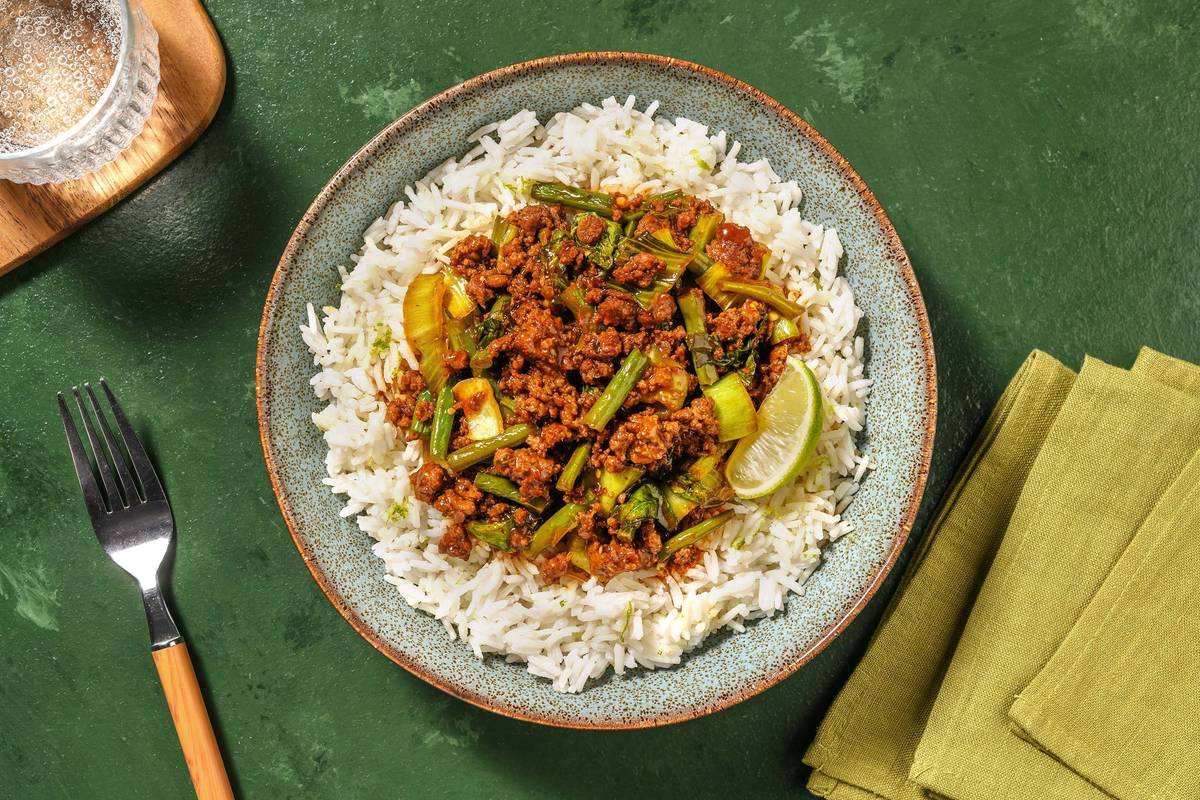 Once the mince has browned, lower the heat and add the pak choi and green beans. Add a drizzle of oil if needed. Cook until starting to soften, 4-5 mins, stirring occasionally.