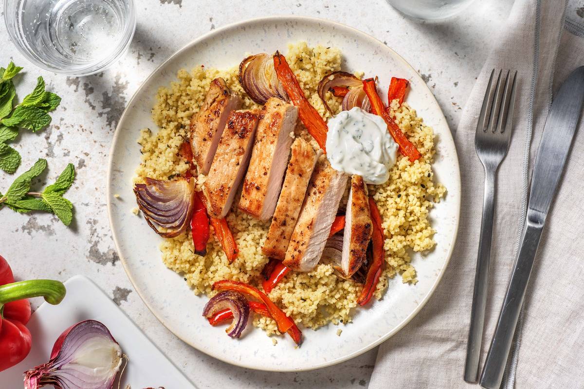 As the pork rests, fluff up the couscous with a fork and spoon onto plates.Serve with the pork and roasted veg on top and drizzle over any pork resting juices.Drizzle over the minty yoghurt sauce and enjoy!
