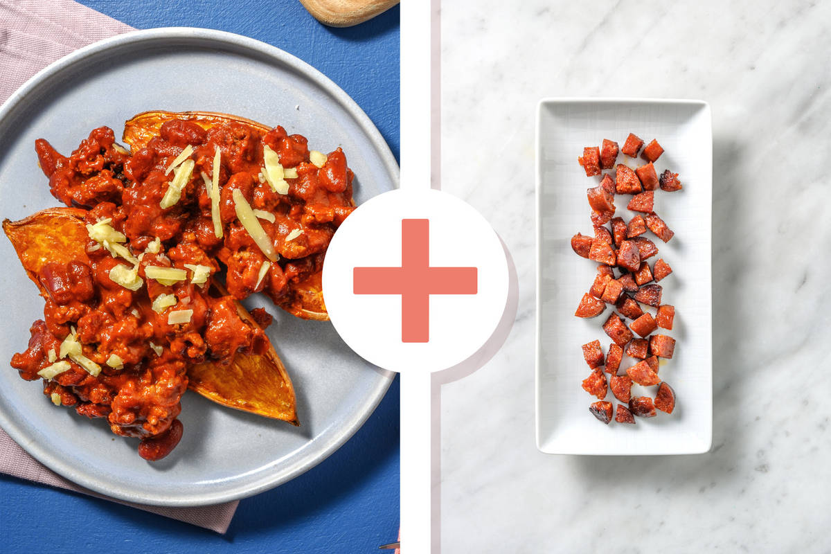 Share the sweet potato jacky-p's between your plates (2 halves per person) and spoon the beef and chorizo chilli on top.