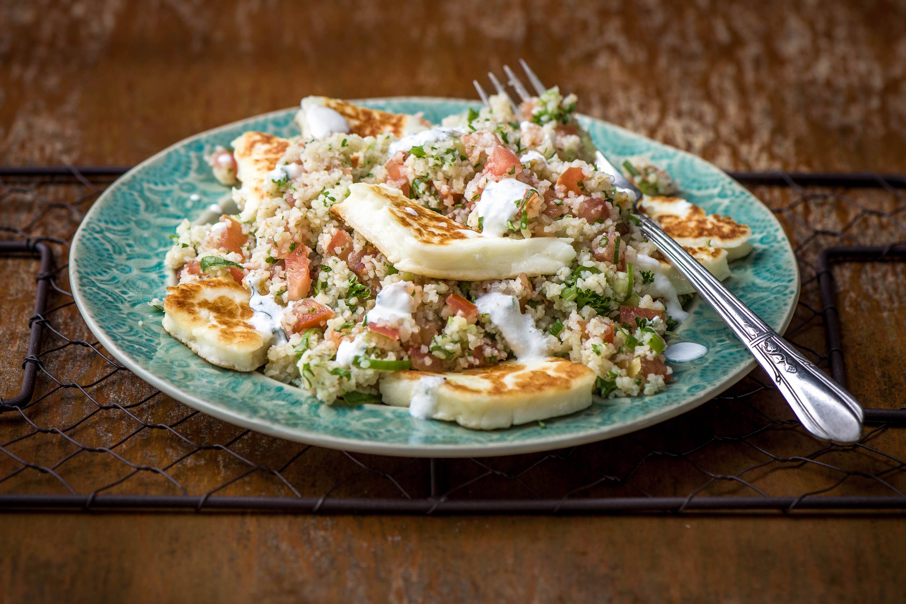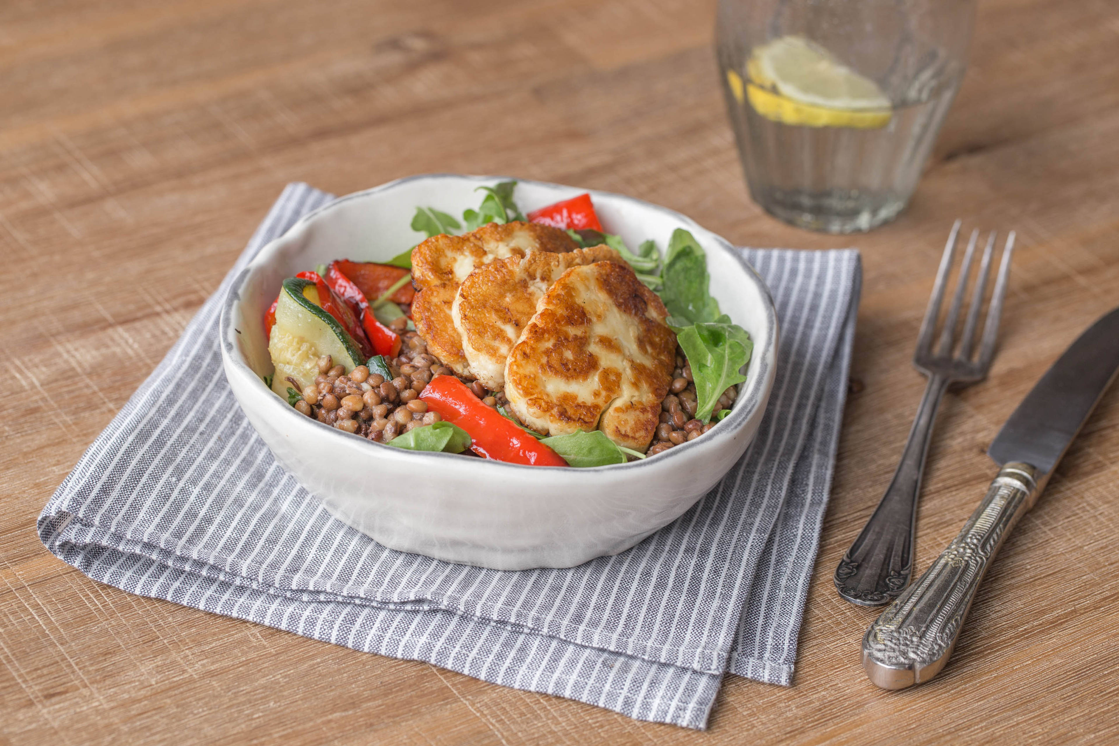 Cut the halloumi slices, then fry until golden, 2-3 mins each side.