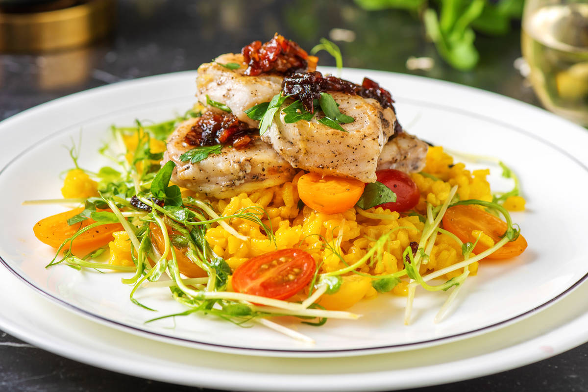 When your risotto is cooked, remove from the heat. Add the butter, cheese and remaining parsley. Stir well so the risotto becomes creamy. Taste and add more salt, pepper and lemon juice to taste. Spoon the risotto into your bowls and top with the monkfish medallions. Top the fish with the bacon jam. Add the peashoots to the tomato bowl and toss to coat. Serve alongside and enjoy!