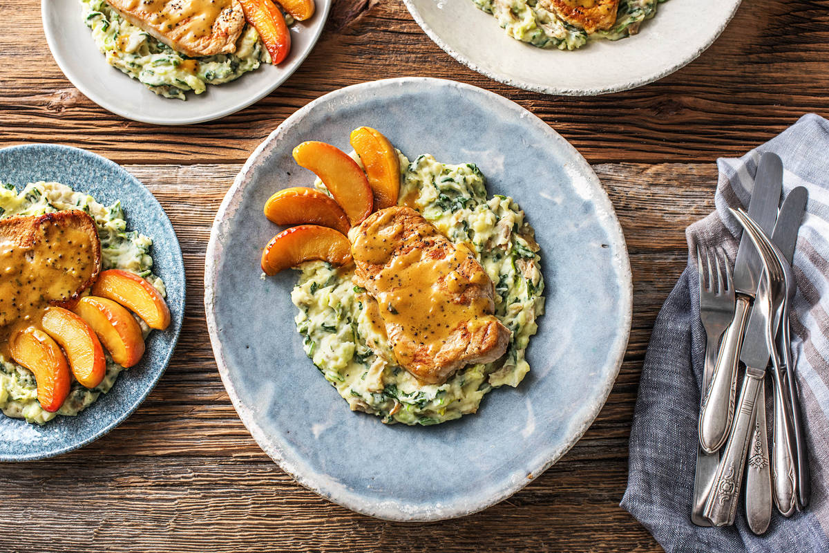 Reheat the mustard sauce if it's gone a bit cold. Serve a pork steak on top of a generous portion of the champ and pop the glazed apples alongside. Finish with a drizzle of mustard sauce. ENJOY!