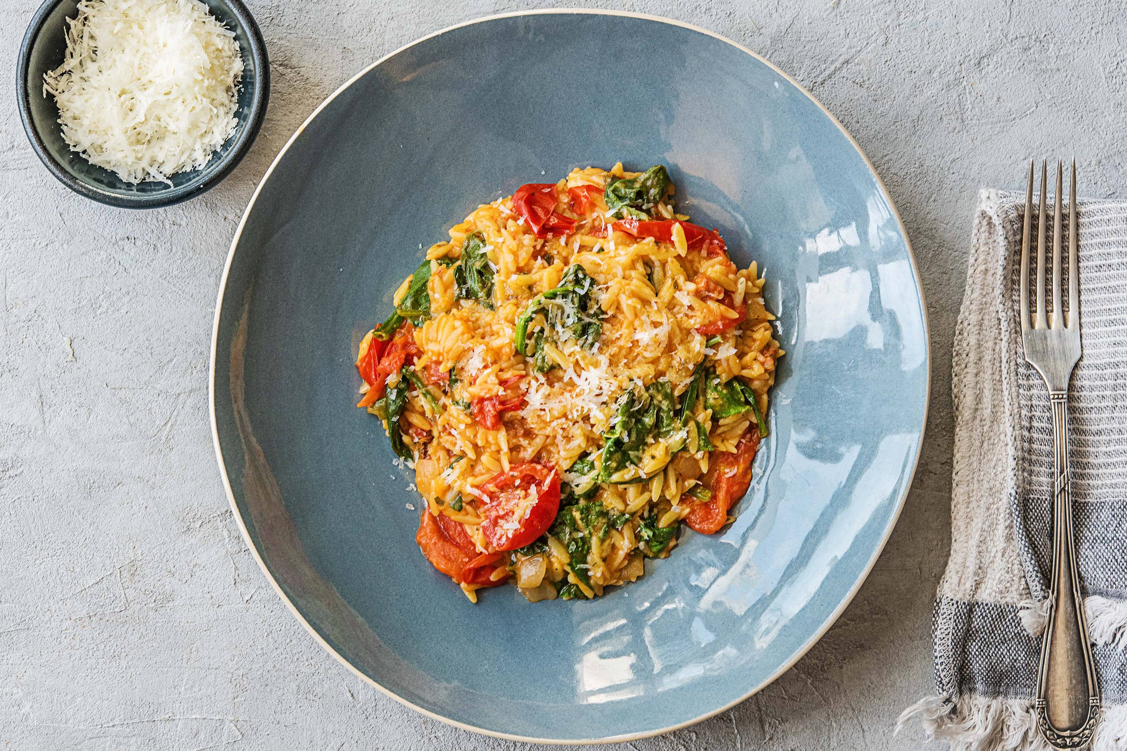 Put a large saucepan of water with a generous pinch of salt on to boil for the pasta. Peel and grate the garlic (or use a garlic press). Halve the baby plum tomatoes. Halve, peel and thinly slice the onion. Finely chop the chives. TIP: You can use also use scissors to chop the chives!
