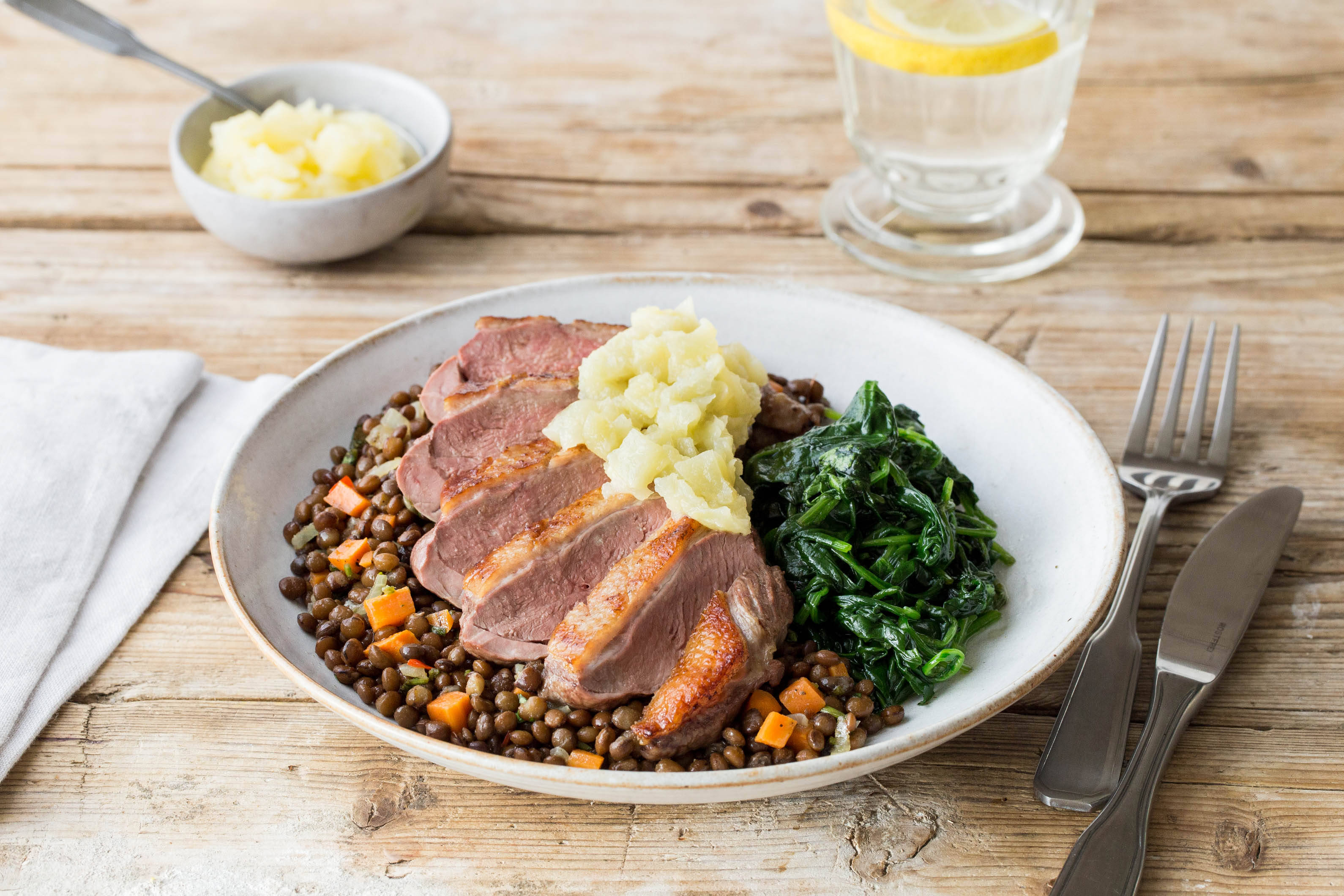 Once the duck has rested, cut widthways into 1cm slices and fan out on your plates.