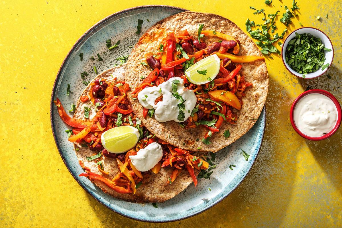Serve the crisp tortillas on plates topped with a helping of the veggie bean mix, a drizzle of lime sour cream and a sprinkling of coriander. Finish with lime wedges for squeezing over. Enjoy!